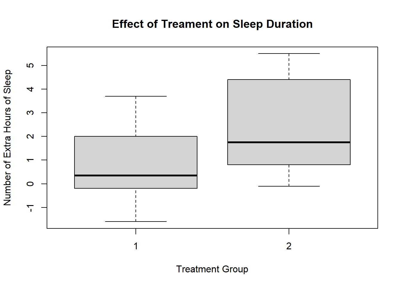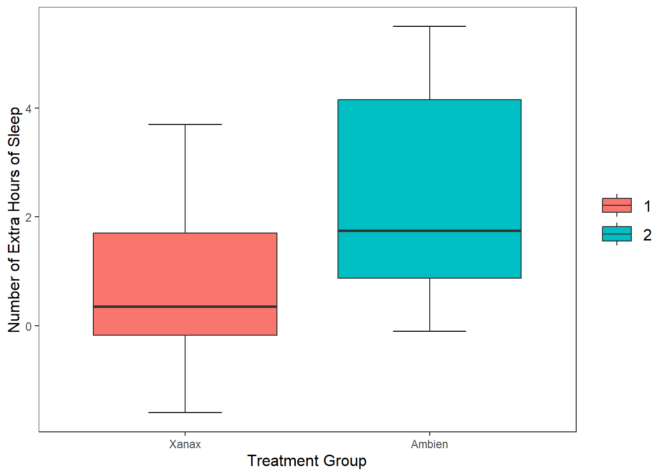 One thing that is bothering me is that our treatment group is labelled as 1 and 2. The sleep data frame does not provide us with any meaningful information about what these values mean. So I am going to take artistic liberties and say that 1 means Xanax and 2 means Ambien.